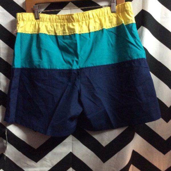 Retro Jantzen swim shorts, elastic waist, horizontal color block design, deadstock, yellow/teal/navy, size 32W