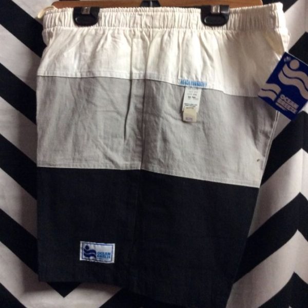 Ocean Breeze swim shorts, elastic waist, horizontal color block design, deadstock, white/gray/black, size 36W
