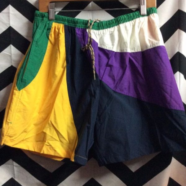 FOREST CLUB SWIM SHORTS – ELASTIC WAIST – COLOR BLOCK DESIGN *DEADSTOCK Forest Club swim shorts, elastic waist, color block design, deadstock, yellow/green/white/black/purple, size L