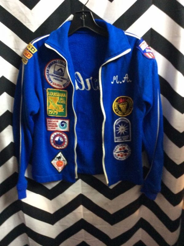 Swim team jacket, cotton, no zipper, Star light M.A. patches, blue/white/red
