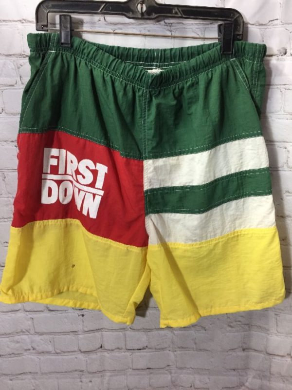 First Down swim trunks, elastic waist, Rasta colors, color-block design, lettering on right leg, red/yellow/green/white, size XL
