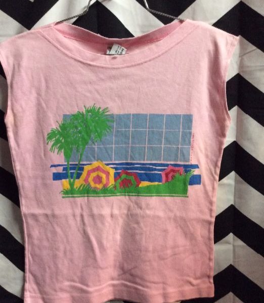 80S T-SHIRT – SLEEVELESS W/PALM TREES & UMBRELLA GRAPHIC DESIGN