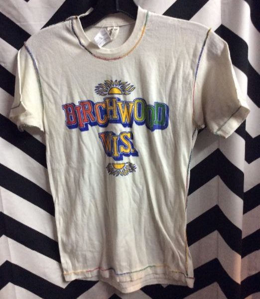 T-shirt, Birchwoon Wis, rainbow lettering design, white/multi