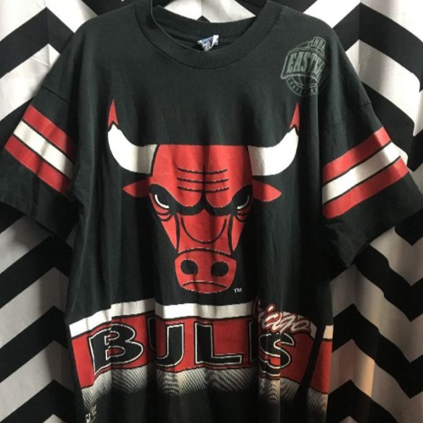 T-shirt, Chicago Bulls, striped sleeves, screen printed designs and logos full front & back, black/white/red, size XL