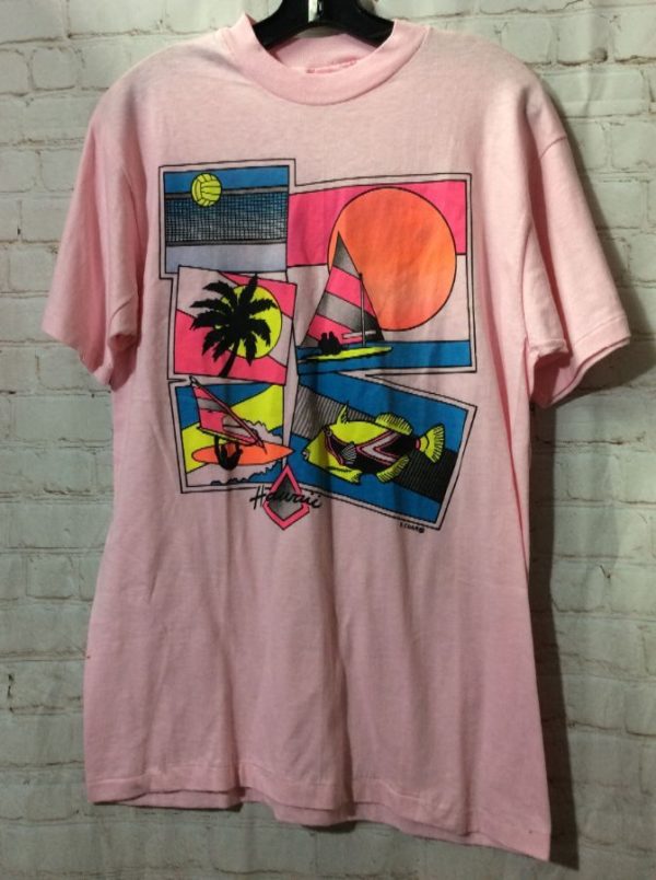 1980’s T-shirt, Hawaii, screen printed graphic design with tropical fish & sailboats full front, neon colors, Neon-pink/neon-orange/blue/neon-green/black
