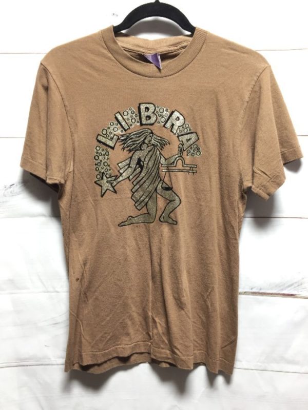 VINTAGE BVD T-SHIRT, LIBRA, ZODIAC SIGN, GLITTER, HEAT TRANSFER DESIGN, BEIGE, SIZE M
