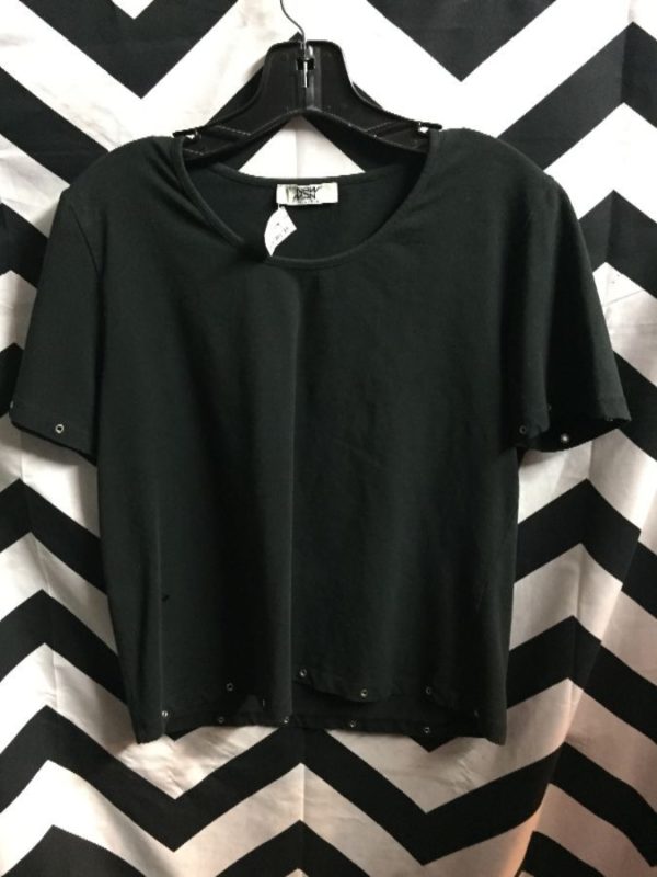 T-shirt, scoop neck, eyelet embellishment trim on sleeves & hem, black, size 5