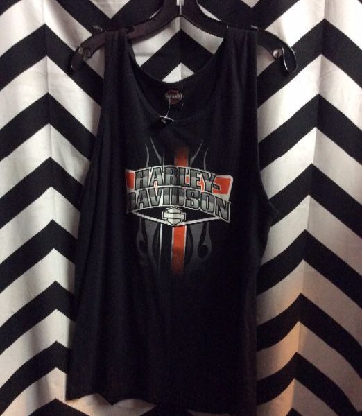 Harley Davidson tank top, Petersons, Miami – Florida, screen printed designs full front and full back, black/gray/white/orange