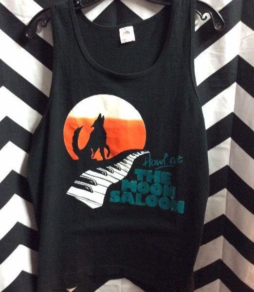 TANK TOP, HOWL AT THE MOON SALOON, SCREEN PRINTED WOLF/MOON PIANO KEYBOARD DESIGN, BLACK/RED/WHITE, SIZE L