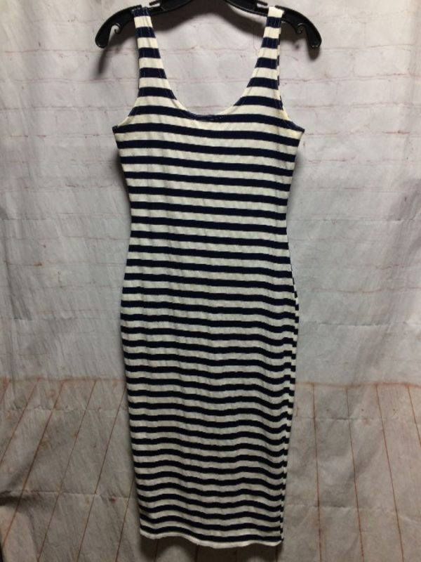 DRESS, COTTON, PULLOVER, SLEEVELESS TANK TOP STYLE, MIDI LENGTH, HORIZONTAL STRIPES, BACK SLIT, NAVY BLUE/WHITE AS IS