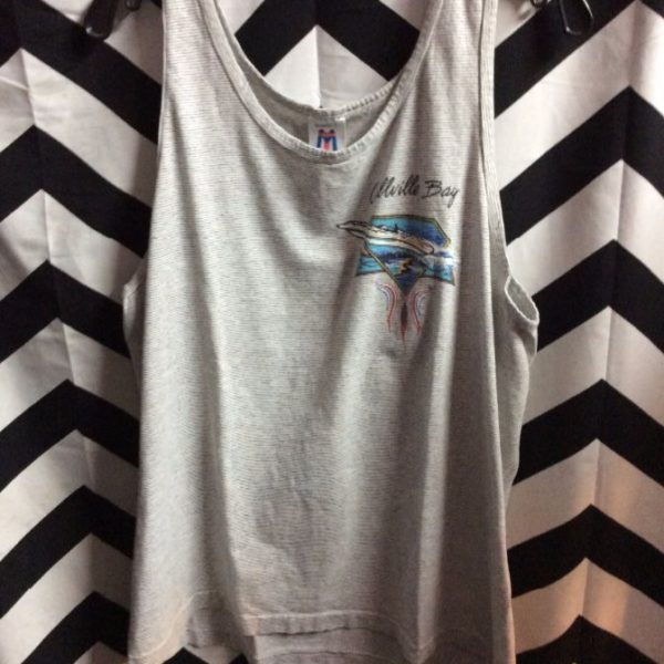 Tank top, Callvile Bay, striped fabric, screen printed speed boat graphic, gray/blue/multi