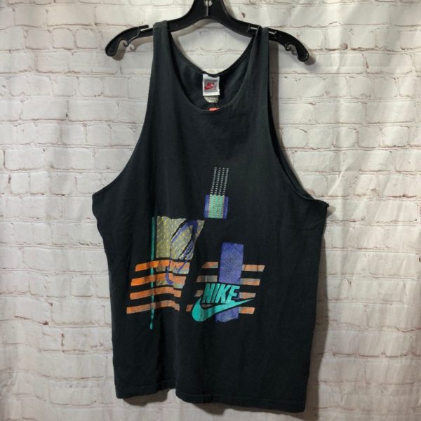 NIKE TANK TOP, MUSCLE TANK STYLE, GRAY TAG, NEON COLORED ABSTRACT GRAPHIC DESIGN FULL FRONT DESIGN, BLACK/NEON ORANGE/NEON GREEN/BLUE, SIZE XL