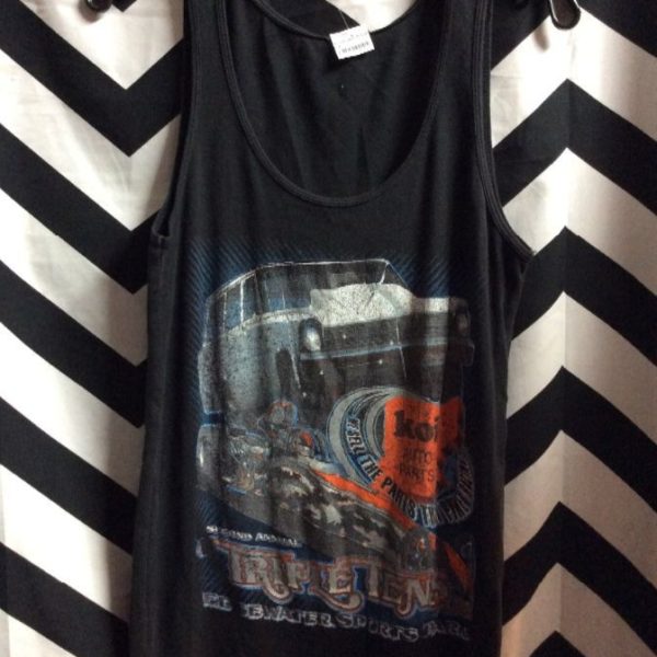 Tank top, Koi Auto Parts, screen printed design, Second Annual Triple Tens – Edgewater Sports Park, softy, black/white/gray/red