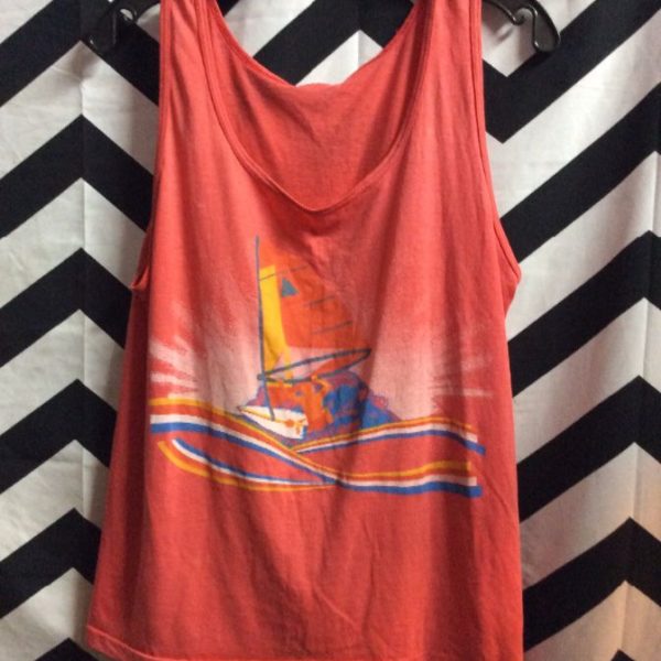 Tank top, soft, screen printed windsurfer hitting wave full front design, red/blue/orange, size M