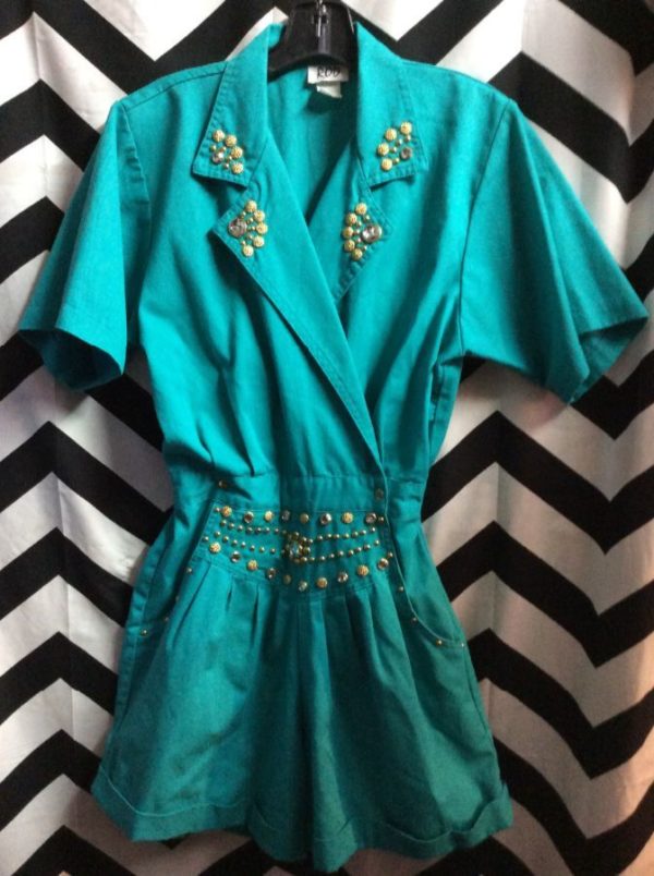 Romper, short sleeves, elastic waist, embellished with metal studs and faux jewel accents, teal/gold, size L