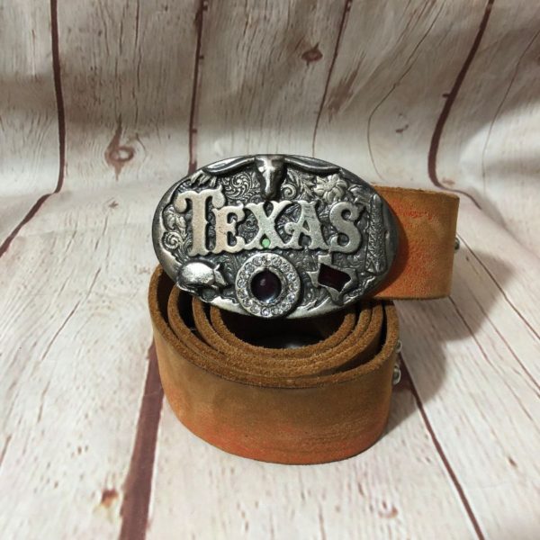 Gap belt, leather, soft, studded designs, Texas/longhorn steer design & gem in heavy ornate buckle, light brown/silver/blue