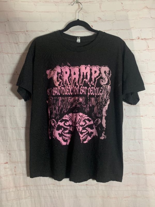 Retro 1997 T-shirt, The Cramps, screen printed front & back graphic with Plastisol ink , Bad Music For Bad People, black/hot pink, size L