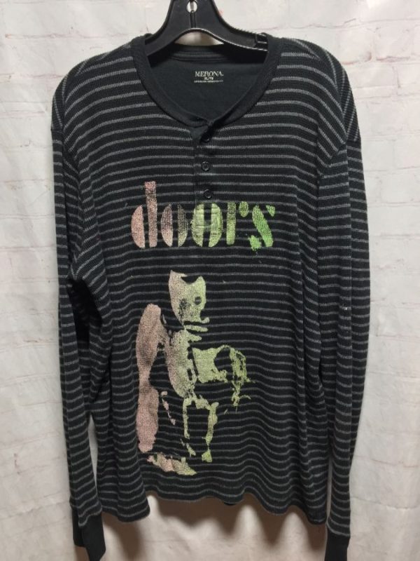 Merona thermal shirt, pullover, 1/4 button-up neck, long sleeves, The Doors, horizontal striped print, gradient screen printed front and back graphics, black/gray/pink/pale green, size XL