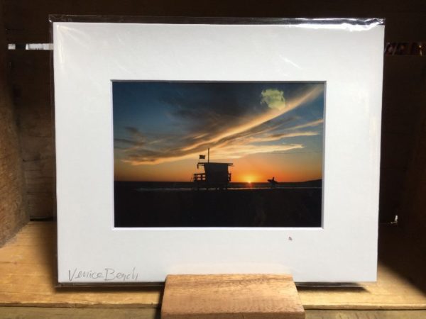 RAY RAE mounted photograph, surfer with surfboard walking down beach at sunset, yellow/orange/blue/creme/black/gray, size 5″ x 7″