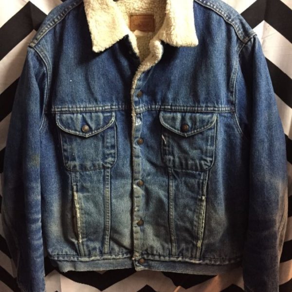 *AS-IS* SHERPA LINED DENIM JACKET CORDUROY COLLAR PAISLEY BRASS SNAP BUTTONS- RIBBED INTERIOR CUFF