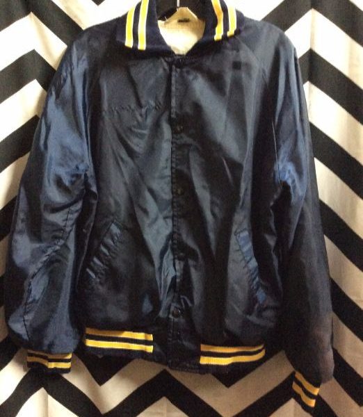 Baseball style jacket, button-up, Ft. Recovery Gun Club, lightweight, striped trim, navy/yellow, size M