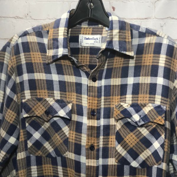 Lumberjack flannel shirt, cotton, long sleeve, button-up, thin fabric, plaid design, 2 front pockets, tan/navy-blue/white , size S As is