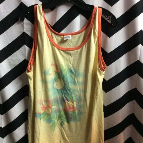 Tank top, ringer neck & arms, screen printed beach scene, thin, yellow/red/blue/green as is