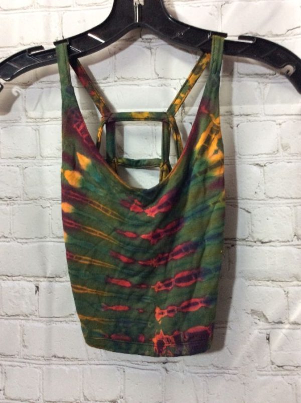 Kathmandu beach top, cage straps, tie dyed, horizontal striped design, olive-green/yellow/red, size S