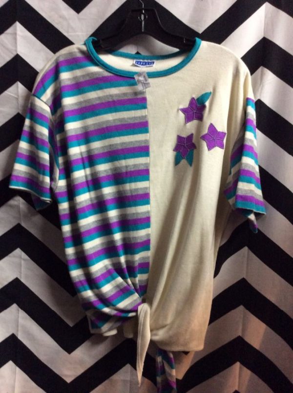 Top, 50/50 front design with horizontal stripes/solid color star flowers design, tied front, white/teal/gray/purple, size L