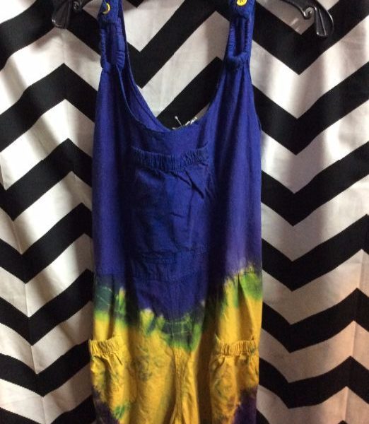 Overalls, cotton, colorful tie-dyed print, purple/yellow/green