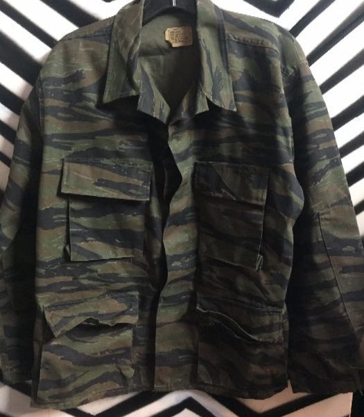 TIGER CAMO MILITARY BUTTON UP JACKET W/ PATCHES