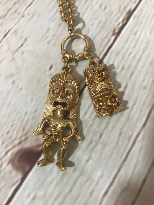 Necklace, 2 charms on chain, Tiki figures, gold metal, dead-stock, gold