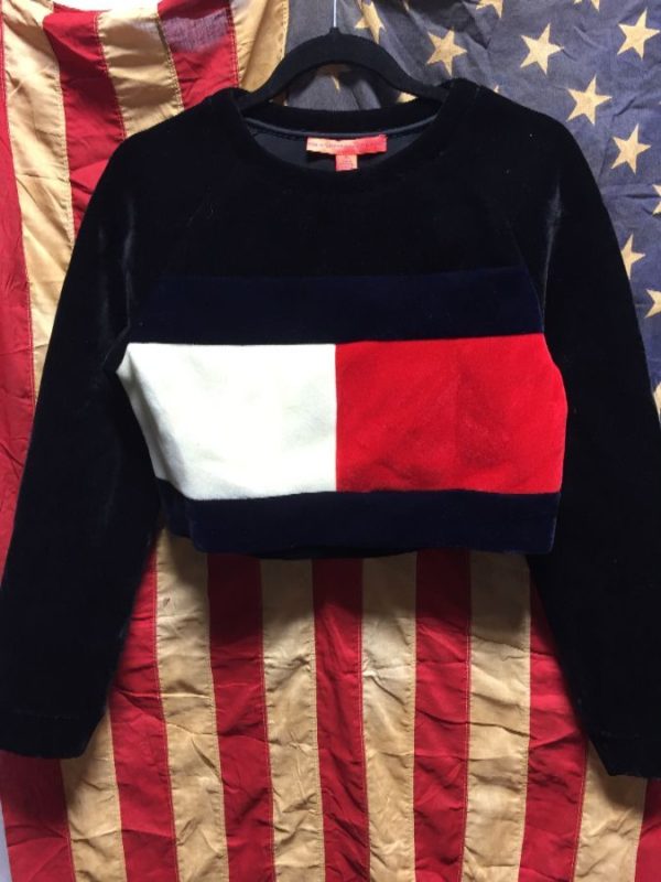 Tommy Hilfiger top, cropped, pullover, velvet, long sleeves, Hilfiger logo colorway in color-block design, black/white/red/navy blue, size XS