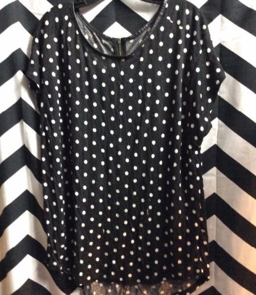BLOUSE, ZIP-UP, SHORT SLEEVE, LEATHER TRIM, POLKA DOT DESIGN, BLACK/WHITE