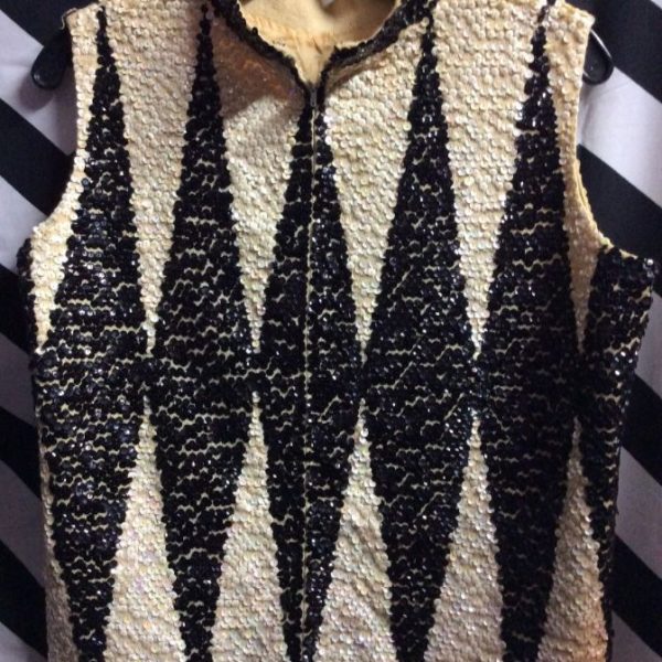 Top, sleeveless, embellished with sequins, vertical triangle/diamond pattern design, black/white, size 16