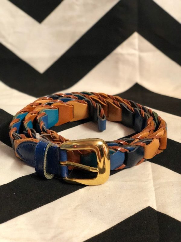 Belts, woven leather, colored ladder design, shiny metal buckle, tan/blue/brown/black/gold, size M