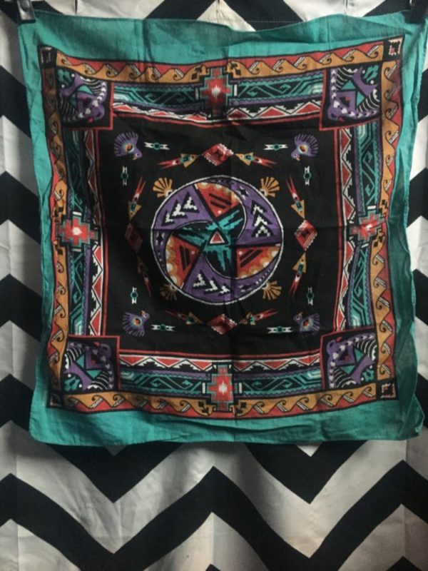 Bandana, Native American design, center circle surrounded by a square with tribal patterns, teal/black/purple/orange/yellow as is