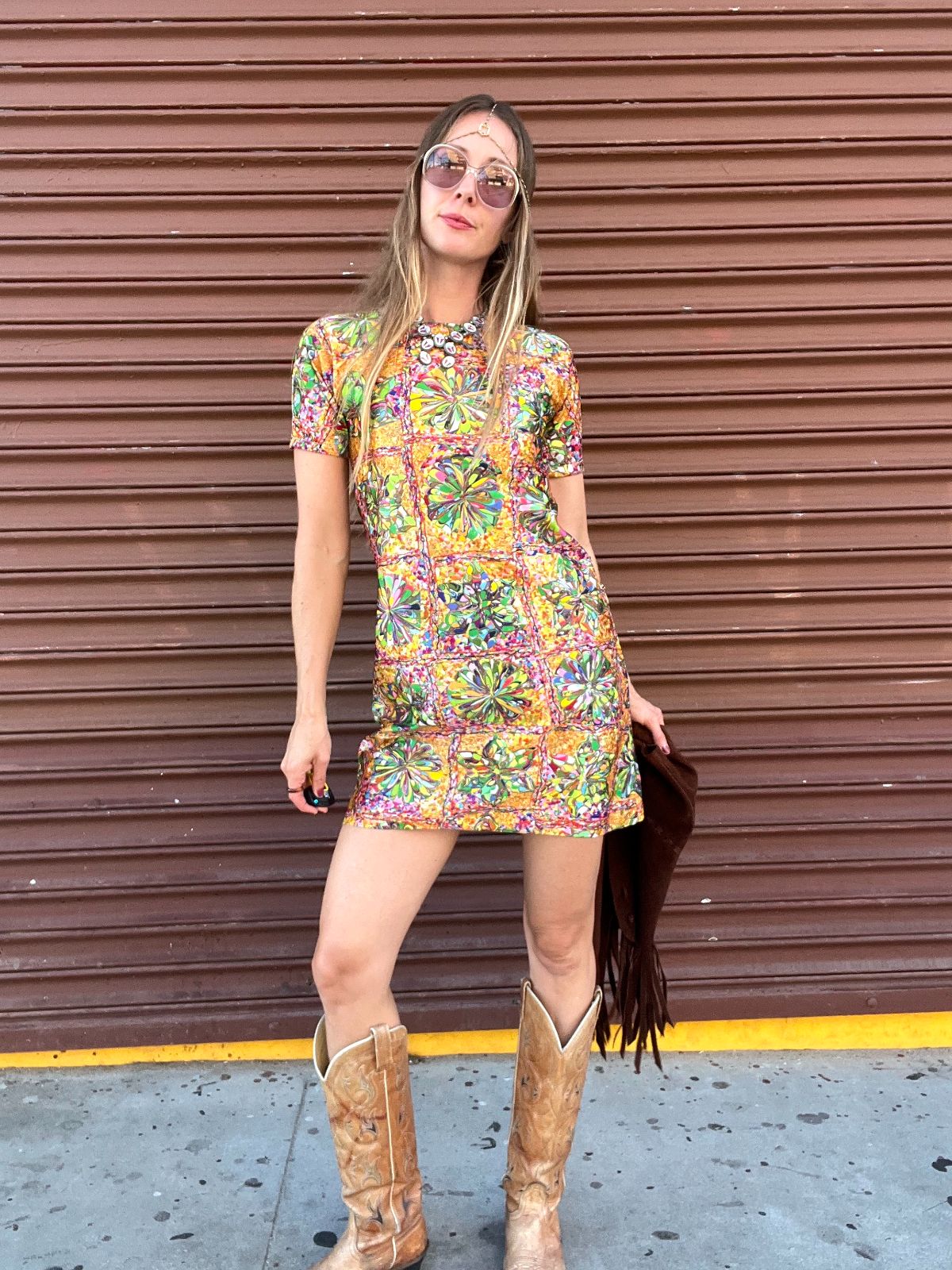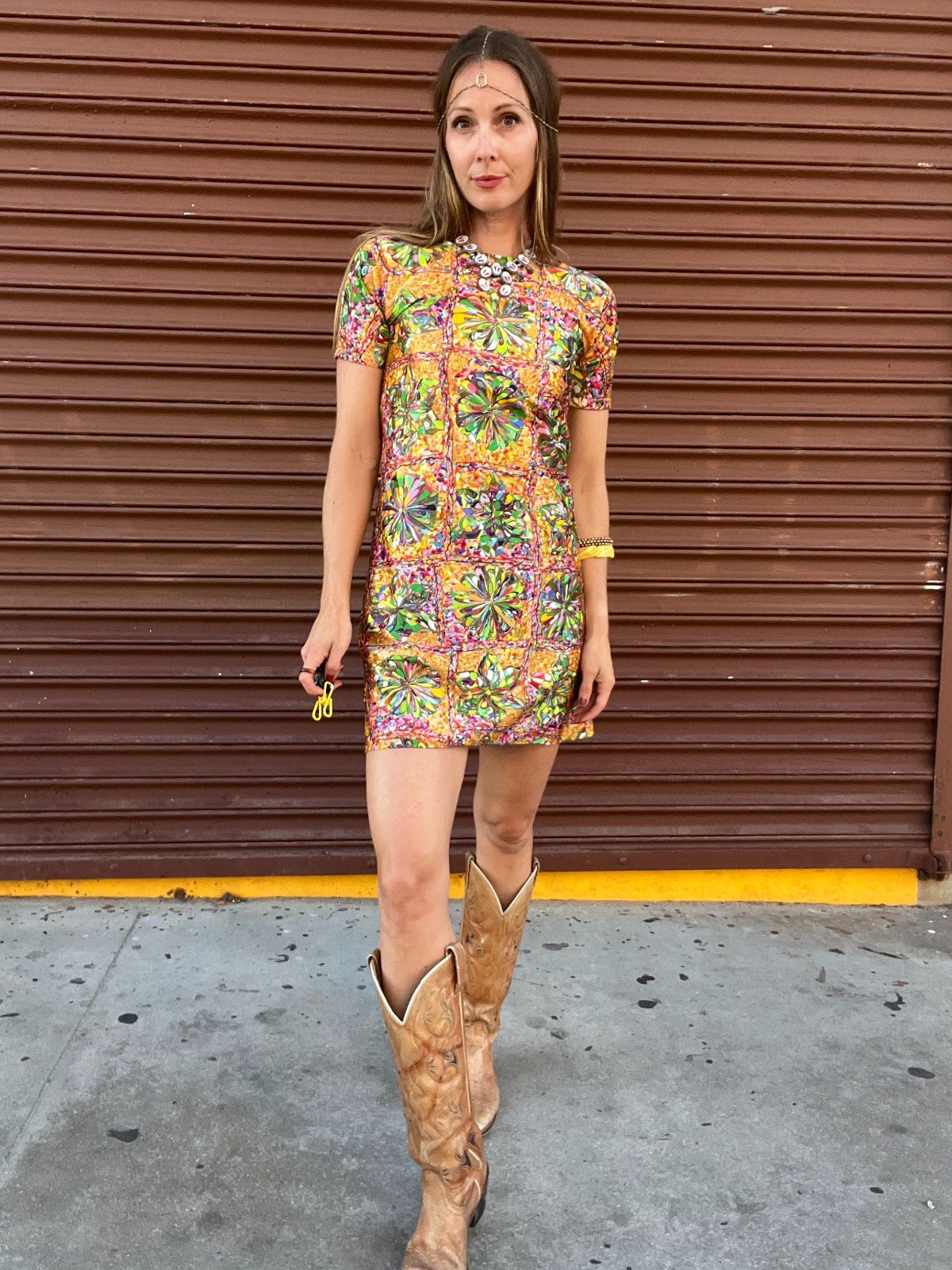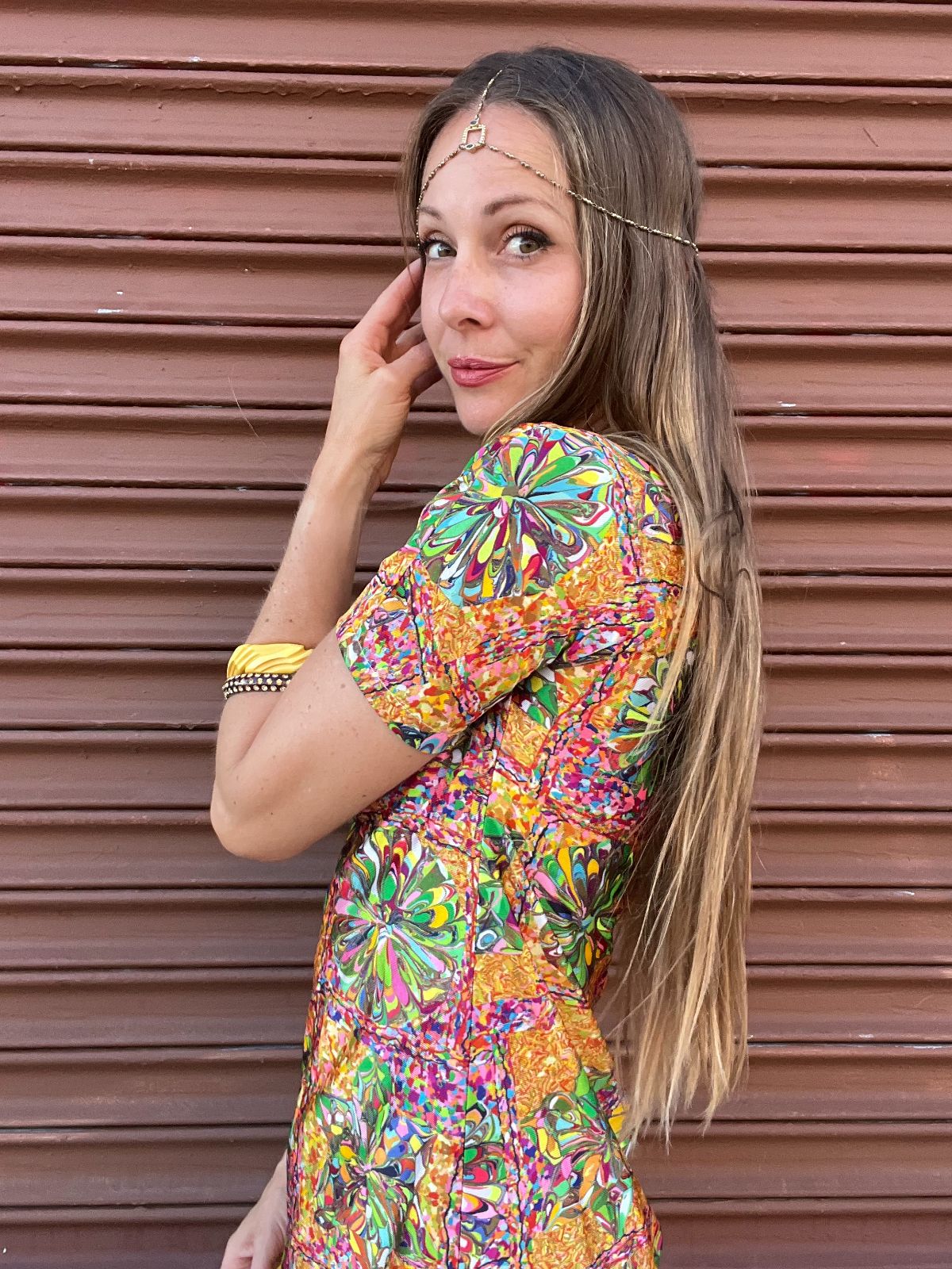 TRIPPY TIE DYE PAINT KALEIDOSCOPE SILKY SHORT SLEEVE SHIFT DRESS