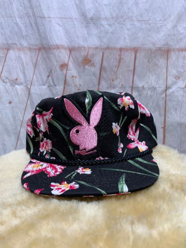 Baseball cap, snap-back, tropical floral print, Playboy Bunny embroidered patch, black/pink/yellow/green/white, size adjustable