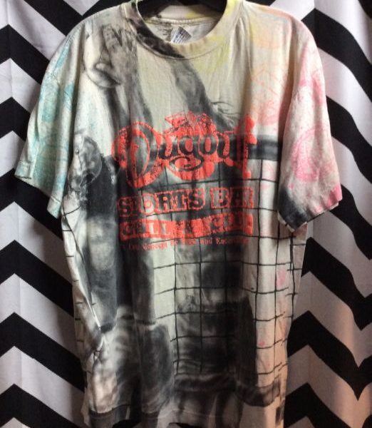 1980S T-SHIRT – DUGOUT SPORTS BAR W/VOLLEY BALLPLAYER GRAPHIC – SPLATTER PAINT DESIGN