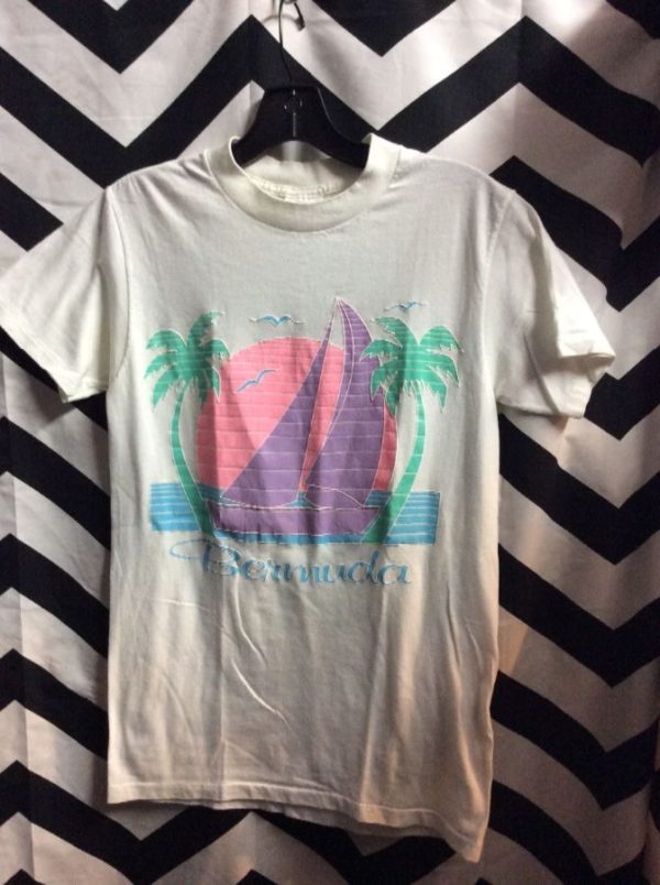 T-SHIRT, BERMUDA SUNSET/PALMS/BOAT GRAPHIC, SCREEN PRINTED FRONT GRAPHIC, WHITE/PINK/GREEN/BLUE/PURPLE, SIZE M