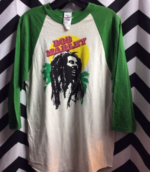 T-shirt, Bob Marley, baseball style tee with colored sleeves, screen printed design full front, green/white/multi, size M