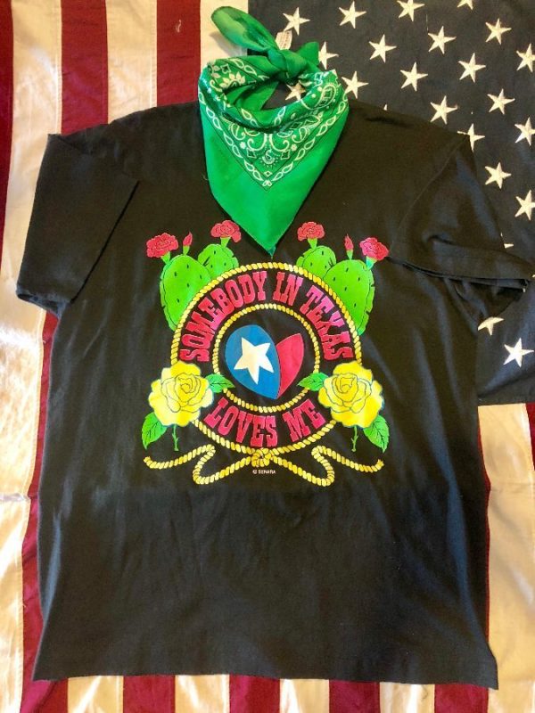 T-SHIRT – CACTUS & ROSES DESIGN – SOMEBODY IN TEXAS LOVES ME – SCREEN PRINTED GRAPHIC – NEON COLORS