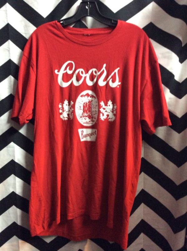 T-shirt, Coors Banquet, screen printed waterfall graphic design with English lions & logo, red/white, size XL