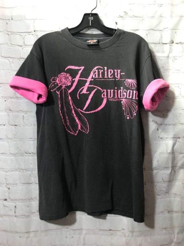 T-shirt, Harley Davidson, cotton, screen printed lettering/rose & feathers front graphic, contrasting trim on sleeves, black/pink, size M