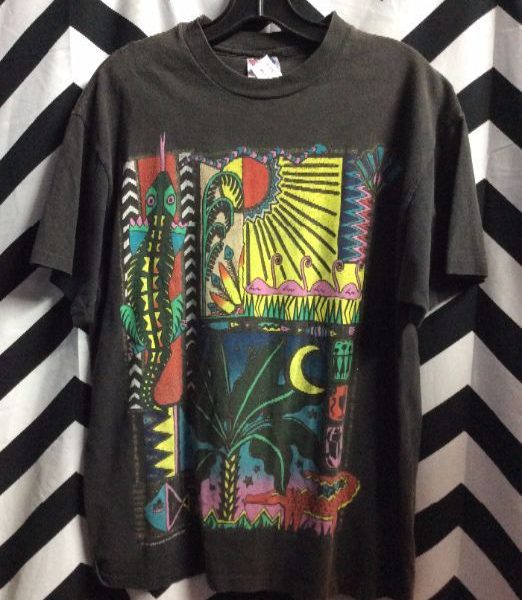 T-shirt, jungle scene with colorful flamingos, palm trees and lizards, black/multi, size L