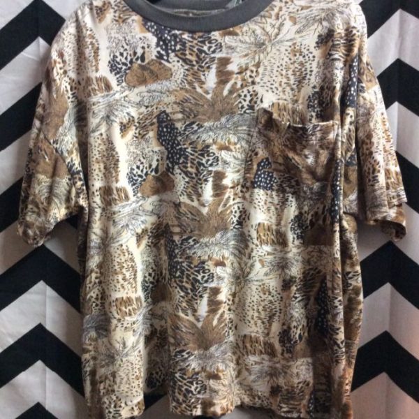T-shirt, ringer tee, front pocket, leopard & jungle plants design print, creme/brown/gray, size L