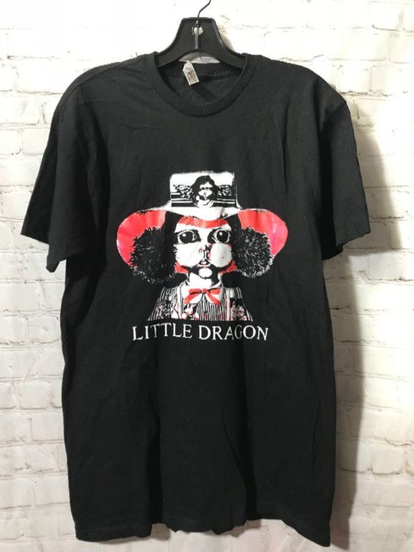 T-shirt, screen printed self titled album cover front graphic design with little girl in floppy hat & Little Dragon lettering, black/red/white, size L