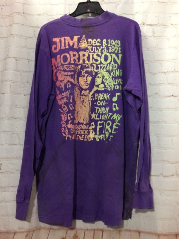 T-SHIRT, PULLOVER, LONG SLEEVES, THE DOORS, JIM MORRISON, THE LIZARD KING, GRADIENT COLORS IN CUSTOM GRAPHIC BY LOCAL ARTIST WITH SCREEN PRINTED FACES/BIRTH-DEATH DATES/SONG LYRICS ON FULL BACK, SCREEN PRINTED GRAPHIC & LETTERING ON FULL FRONT, PURPLE/YELLOW/PINK, SIZE XL AS IS