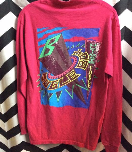 Bugle Boy T-shirt, long sleeve, Ultimate Force, screen printed designs front chest and full back, dark pink/green/blue/black